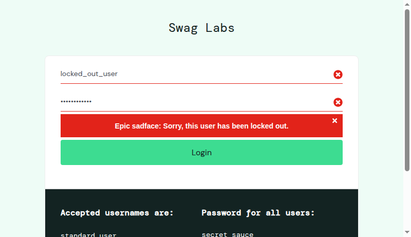 I verify an error "Epic sadface: Sorry, this user has been locked out." is displayed on the login page